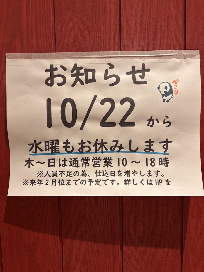 人員不足のため、次の水曜から定休日を月火水の3日間となります。